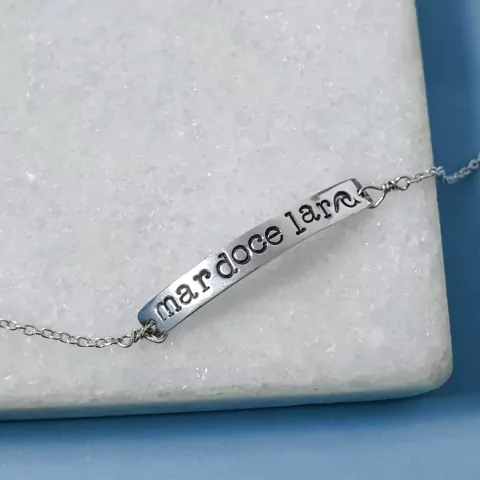 Pulseira com corrente cadeado, plaquinha carimbada a mão, com detalhes envelhecidos em prata 925.